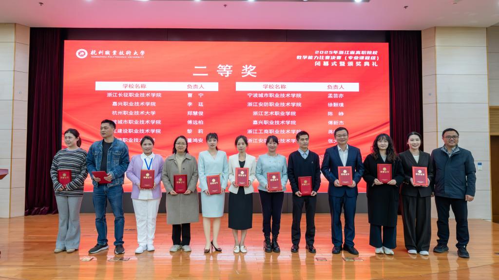 11月23日,2025年浙江省高职院校教学能力比赛决赛在杭州职业技术大学、台州科技职业学院落下帷幕。经过激烈角逐,我校人文与管理学院陈媛媛团队获公共基础课程组一等奖、护理学院曹宁团队获专业课程一组二等奖、智能技术学院叶莉莉团队获专业课程二组二等奖、商务与贸易学院徐雅琴团队获专业课程一组三等奖。