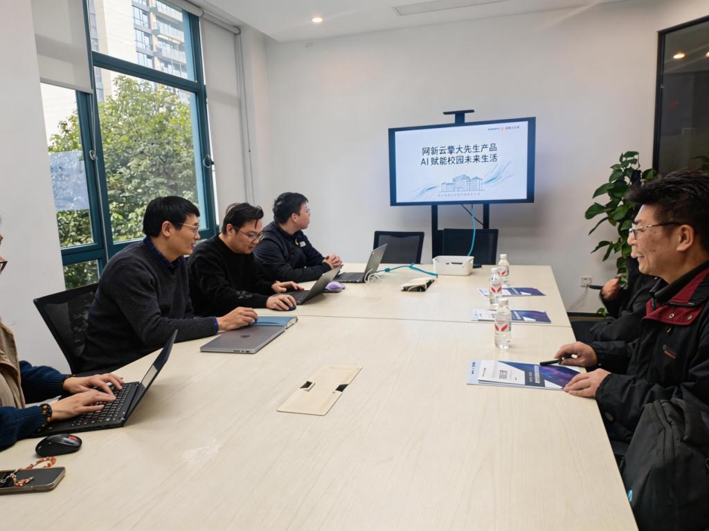 在浙江华通云数据科技有限公司,教师团队重点围绕“AI+教育”开展学习交流。企业专家李卫峰详细介绍了云计算、数据中心及AI应用等核心技术,展示了“网新云擎大先生”等产品在智慧校园场景中的实践应用。双方就将AI技术融入课程体系、优化人才培养方案、培养数字时代复合型技术技能人才等内容进行深入探讨。