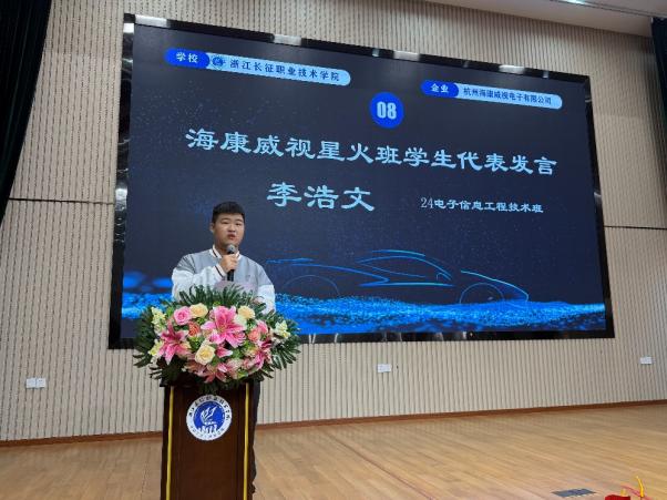 星火班学生代表李浩文上台发言,表达了对学校和企业的感谢,以及对未来学习生涯的憧憬与决心。