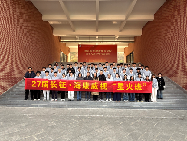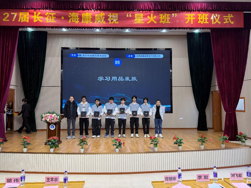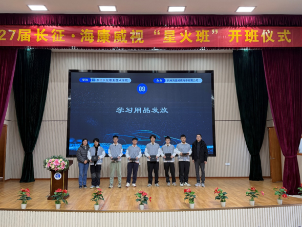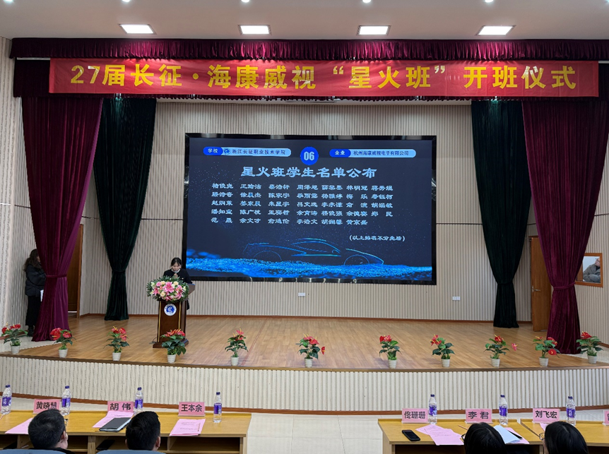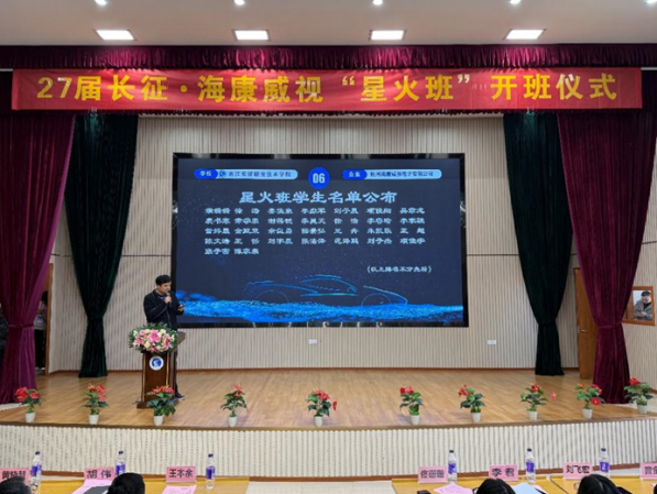 2025年12月18日中午,浙江长征职业技术学院与杭州海康威视电子有限公司(以下简称海康威视)在学校第二报告厅隆重举行“海康威视星火班开班仪式”。杭州海康威视滨江生产基地生产总监王本余、高级招聘经理胡伟,智能技术学院党总支副书记佟珊珊,电子信息工程技术教研室主任李君,汽车电子技术教研室主任刘飞宏,专任教师代表、辅导员代表及第三期“星火班”全体学员等参加此次会议。