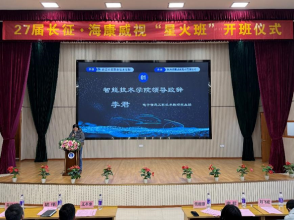 首先智能技术学院电子信息工程技术教研室主任李君致欢迎辞,代表学院对海康威视公司的大力支持表示感谢,并对入选第三期“星火班”的同学们表示祝贺。