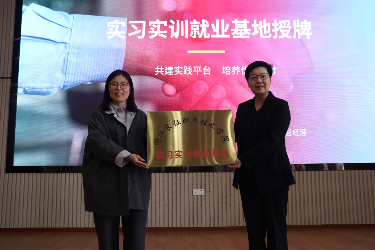 随后,授牌与揭牌仪式依次举行:张晓燕向王赟授予“浙江长征职业技术学院实习实训就业基地”牌匾;梁爽爽与梅灿华共同为“电信天翼订单班”揭牌。