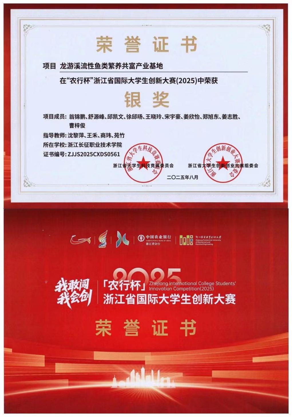近日,由浙江省教育厅、共青团浙江省委员会、浙江省科学技术协会、浙江省学生联合会共同主办的"农行杯"浙江省国际大学生创新大赛(2025)在浙江机电职业技术大学落下帷幕,我校沈黎萍、王禾等4位老师指导的《龙游溪流性鱼类繁养共富产业基地》项目首次入围省级决赛并斩获银奖。