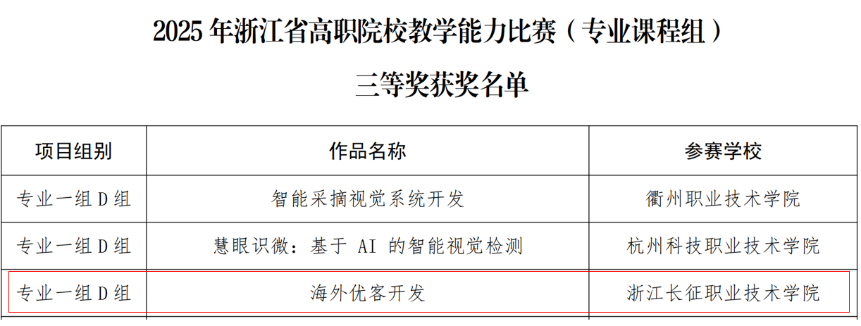 近日,2025 年浙江省高职院校教师教学能力竞赛落下帷幕,我院《国际贸易操作实训》课程团队(徐雅琴、俞乔、吴小平、许胜兰)凭借扎实的专业功底、创新的教学设计和默契的团队协作,以参赛作品《海外优课开发》荣获省赛三等奖。