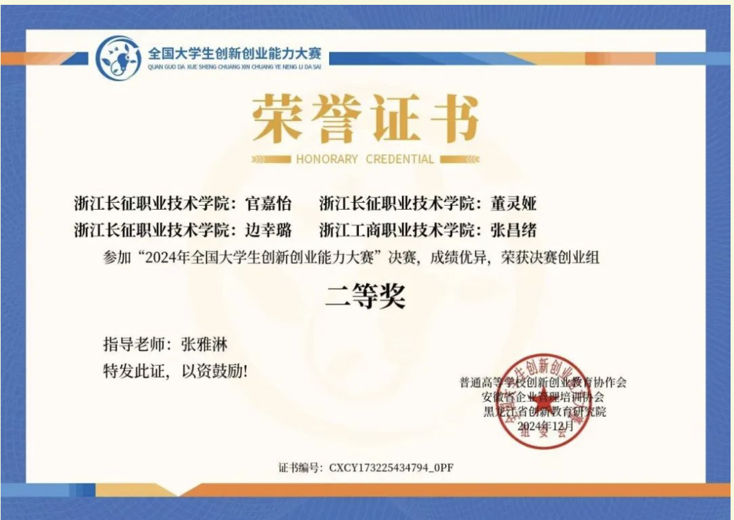 在决赛中,评审专家组依据作品的创新性、实用性、市场潜力等多个维度进行了全面评审,管理学院工商企业管理学生官嘉怡、董灵娅、边幸璐团队获全国二等奖,俞宋宸同学获优胜奖,张雅淋老师获优秀指导教师奖。